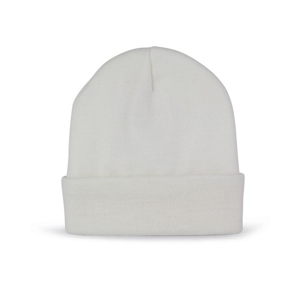 Knitted turn-up beanie made from 50% acrylic and 50% recycled polyester.