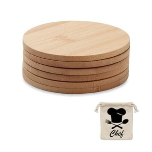 The set includes 6 round bamboo coasters and 1 cotton drawcord bag.