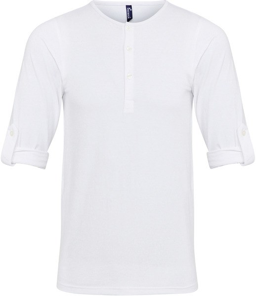 This t-shirt has a round neck with a 3-button opening , it can be worn long- sleeved or rolled up thanks to its button placket on the sleeves .