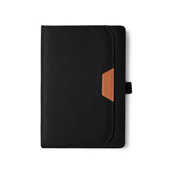 A5 notepad with 600D RPET hardcover and PU with outer pocket.