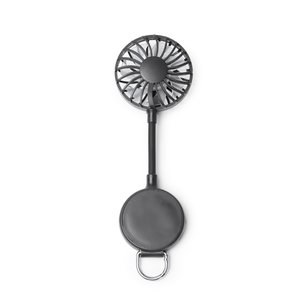 Handheld fan made from recycled ABS, with a 500 mAh rechargeable battery charged via cable.