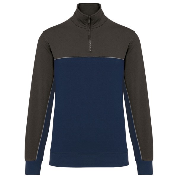Contrasting piping between the two-tone parts of the garment (body and sleeves, front and back).