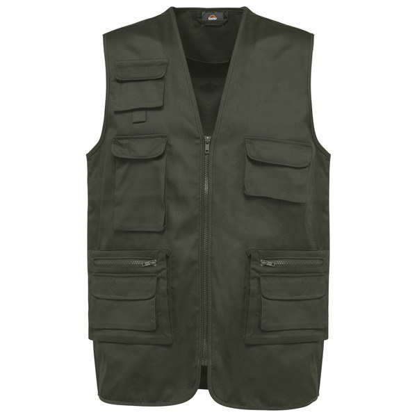 2 double gusseted patch pockets at the front, 1 with flap and 1 with matching plastic zip + 3 gusseted patch chest pockets with flap and tear release fastenings, various sizes.